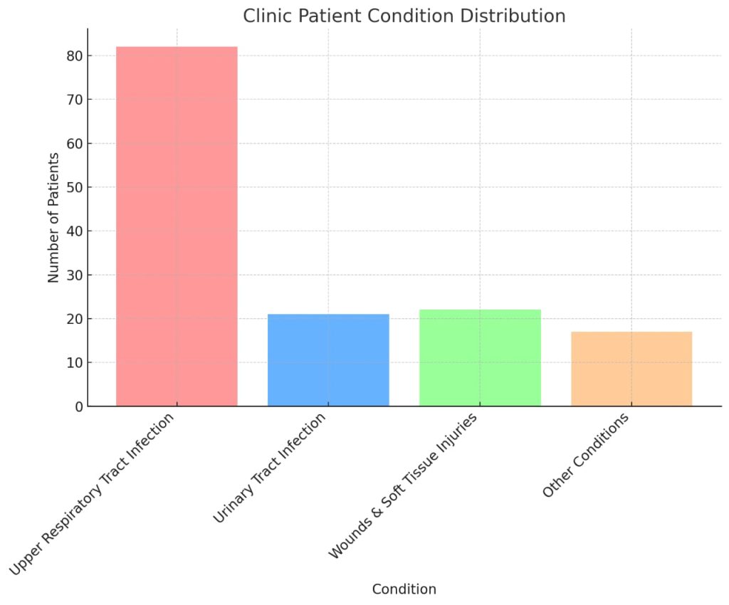 After the establishment of the clinic we were able to access the most common diseases and conditions that affected most of our patients. Here is the bar chart analyzing the distribution of patient conditions in the clinic. Each condition category shows the number of patients diagnosed, providing a clear visual of the most and least common conditions.