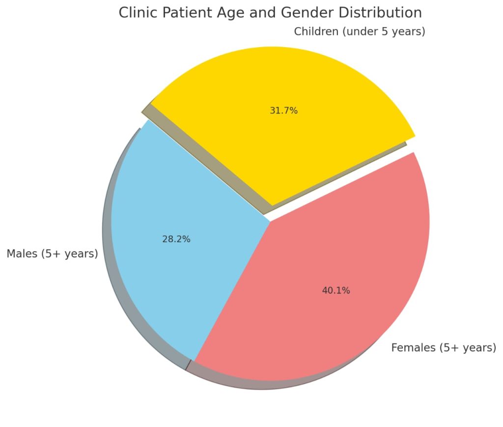 We receive an average of 450 patients per month. The pie chart below demonstrates patients’ data for the month of October. (The data presented in this report was collected over the month of October 2024, to enable us to give most recent information.)